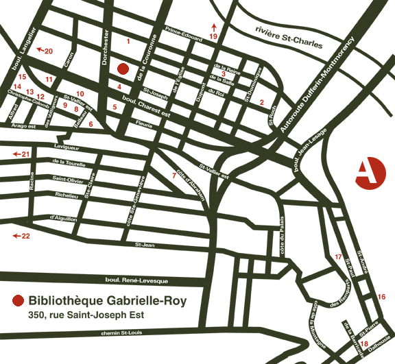rue Saint-André Jean Gaudreau 347, rue Saint-Paul Gabriel Lalonde 17, rue de la Barricade, #305 Pierre-Georges Tabouillet 552, boul. Wilfrid Hamel Place Fleur de Lys, (près du Second Cup) Lyse Collin-Marsan 550, rue Marie de l'Incarnation Jacques Samson 72, rue de la Tourelle Michel Parent 675, rue Marguerite Bourgeois, #106 Edmonde Poirier-McConnell |